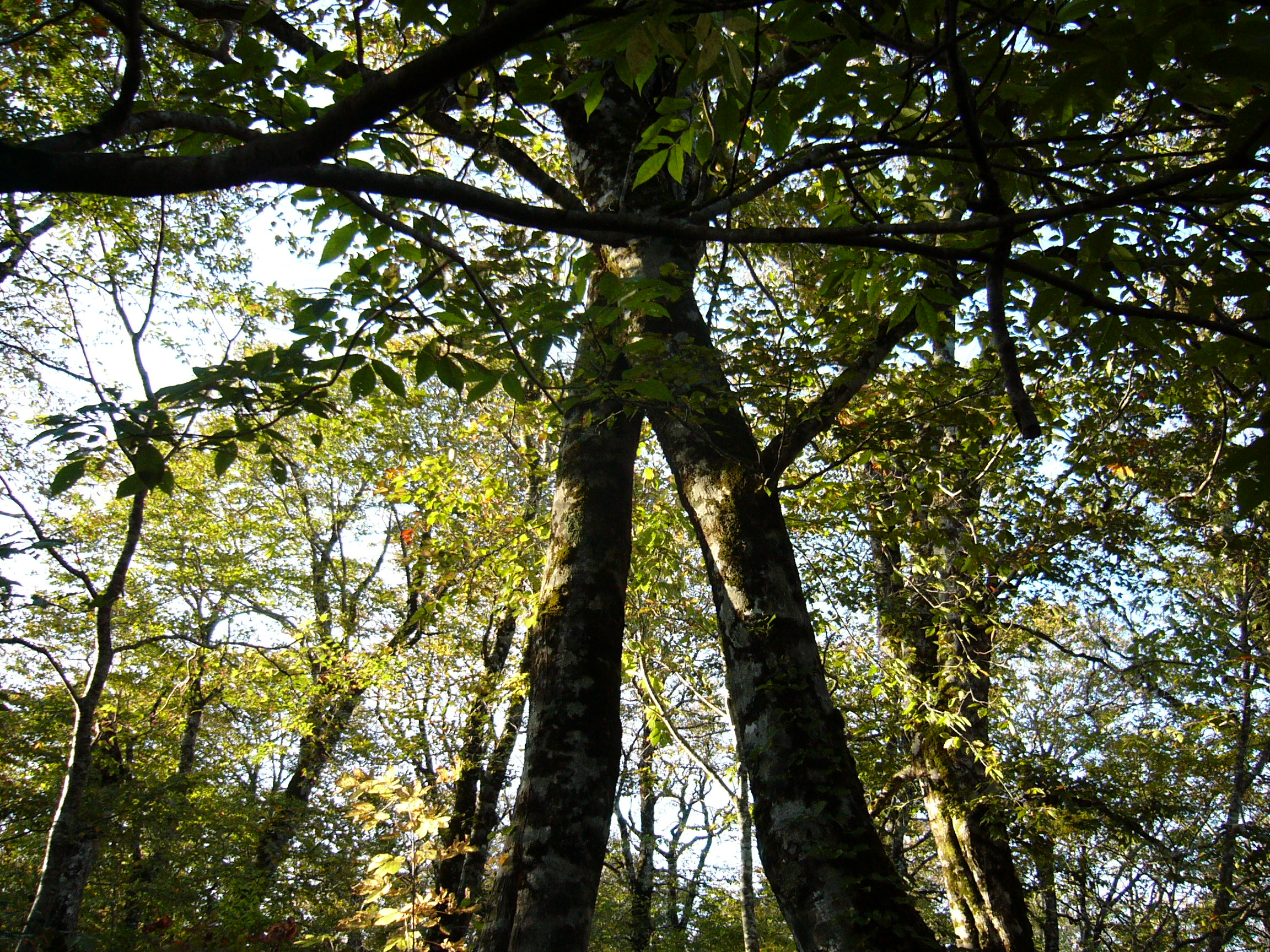 登山道周辺には、たくさんの実が落ちていました。 百科時点で調べて見ると、「ブナは生長するにしたがって、根から毒素を出していく。そのため、一定の範囲に一番元気なブナだけが残り、残りのブナは衰弱して枯れてしまう。ところが、一定の範囲に2本のブナが双子のように生えている場合がある。これは、一つの実の中に2つある同一の遺伝子を持った種から生長したブナである。」と書いてあります。 この抱擁樹は、この説明にあるように、同一の遺伝子を持った種から生長したのでしょう。