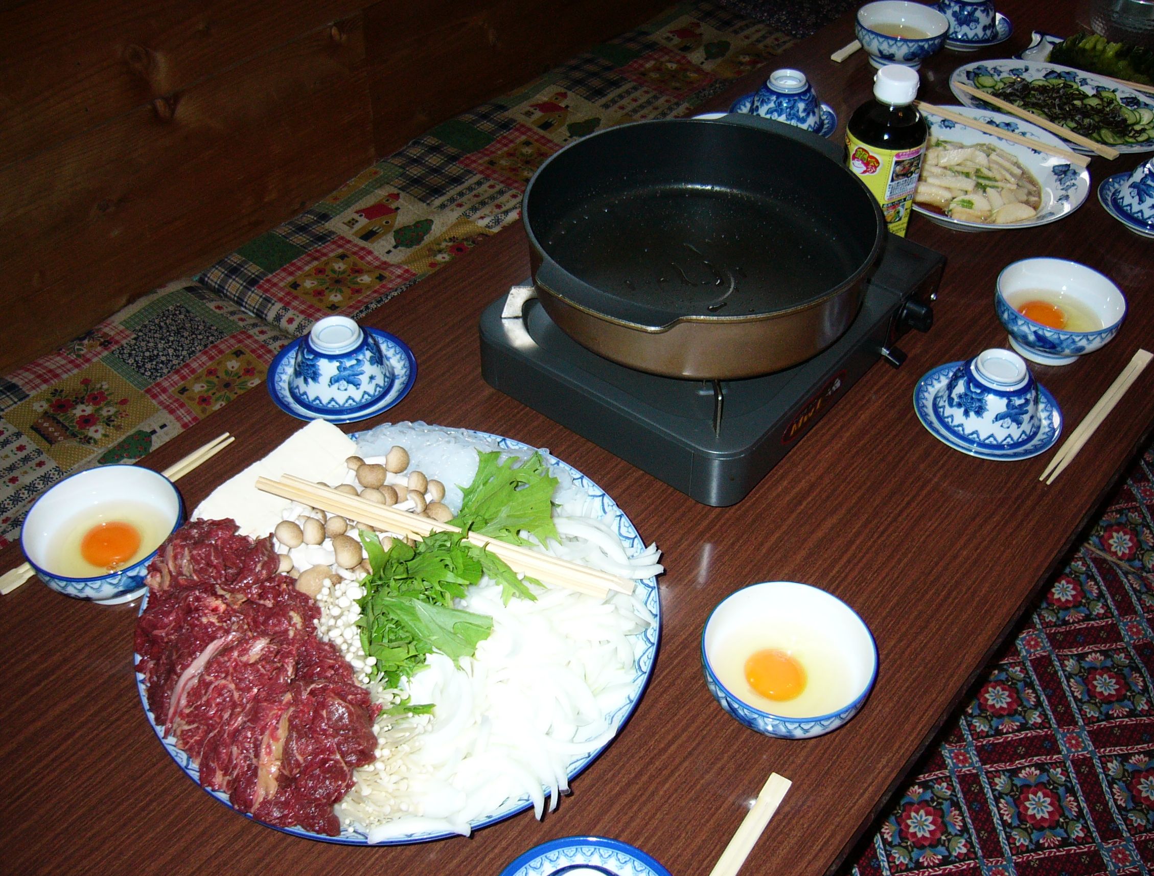 北横岳ヒュッテの夕食は、馬肉のすき焼きでした。8月10日、東京は猛暑。北八ヶ岳は、湿度が低く爽やかでした。そんな空気の中での鍋を囲んでの夕食でした。山芋のポン酢あえときゅうりとわかめのポン酢あえもついて、ボリューム満点。