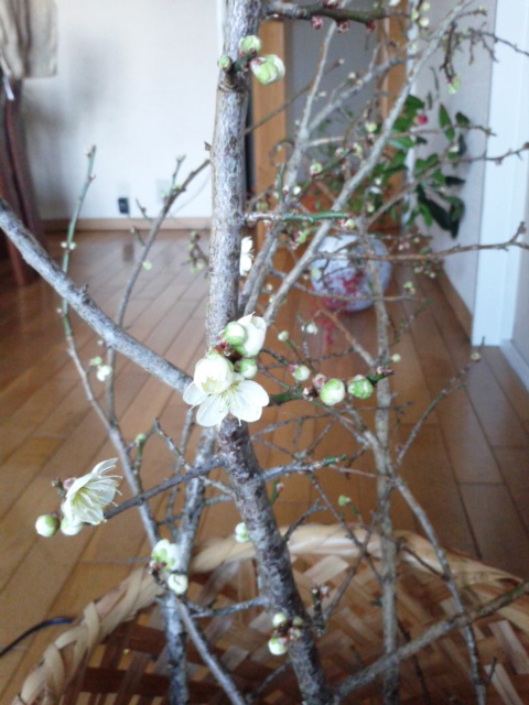 リビングの竹籠に飾って約2週間、梅の花が咲いてほのかに香っています。