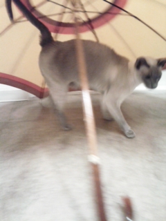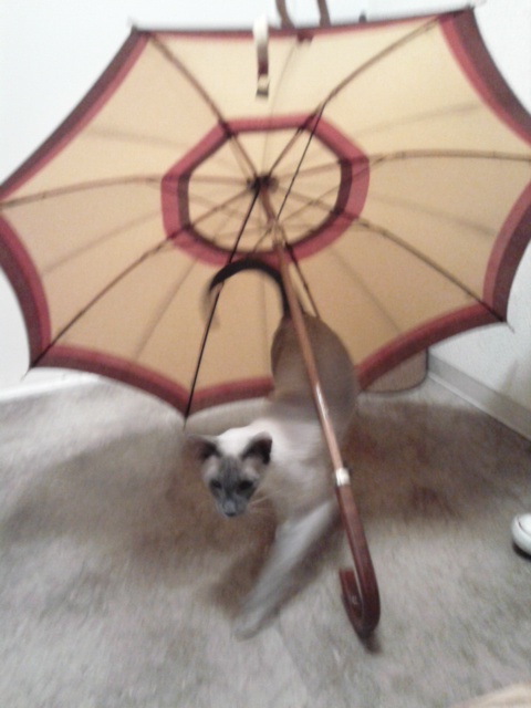 吾輩は、傘の下に入ってクルクル回って遊んでいます。好きな遊びのひとつです。