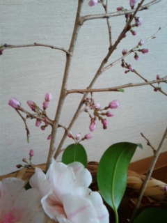 一昨日までは、蕾に桜色は見られなかったのですが、今朝は、花が開きかけています。
