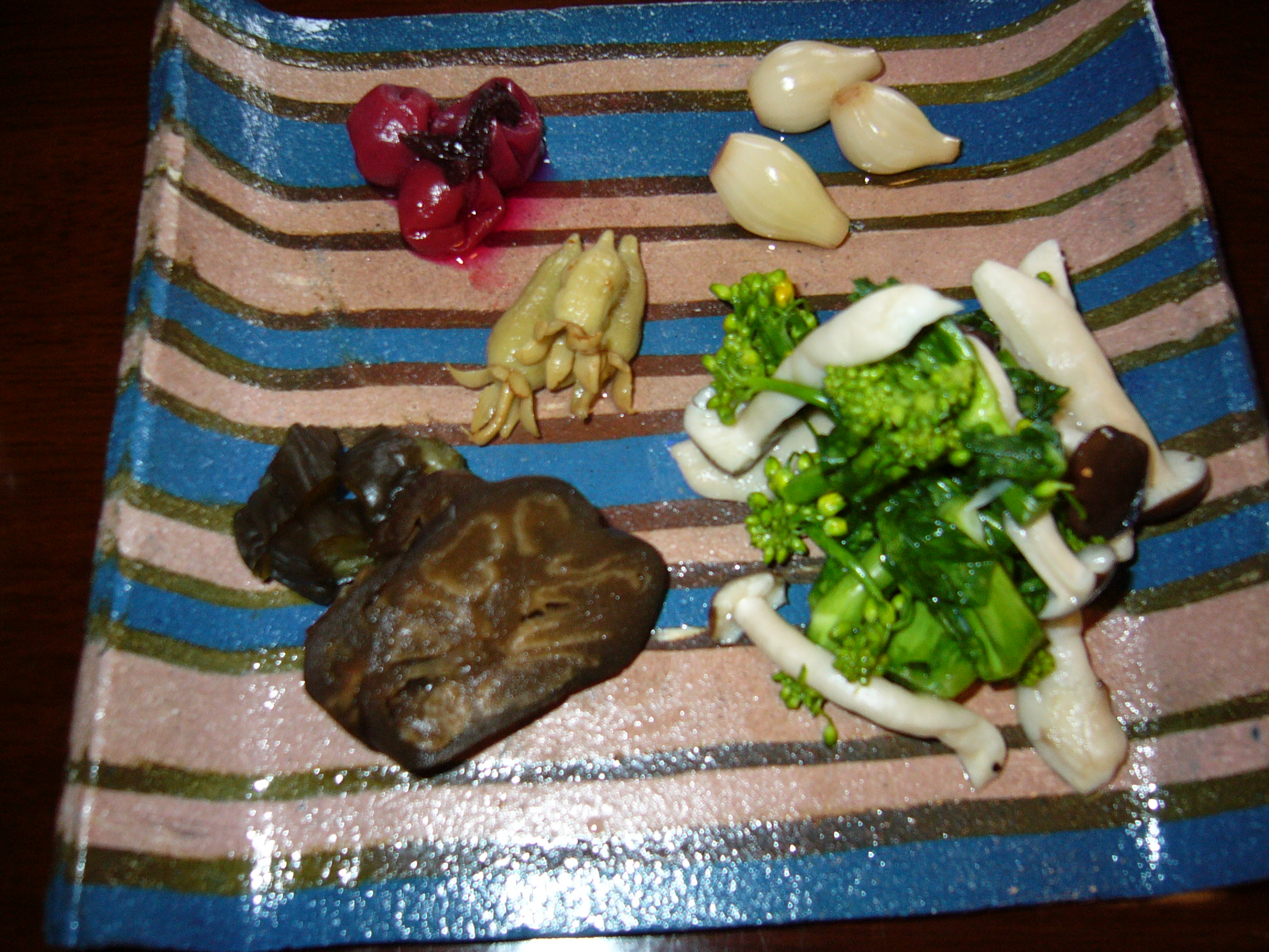 お漬物は、真ん中にあるイカの形をした物は、マタタビの漬物、手前の緑色は、小松菜の花とシメジです。その左側は、瓜の味噌漬け、もちろん、味噌も自家製でした。おかみさんは、東京出身だそうです。すべて手作りの生活にあこがれて、夫婦で民宿を営む現在の生活があるようです。