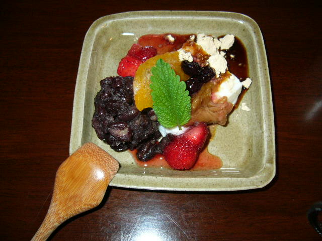 デザートは、牛乳を葛で固めたもの、杏と苺のシロップ漬け、小倉餡など、酸味と甘さのバランスの良いデザートでした。もちろん、小豆もすべて自家製、竹製のスプーンも手作りでそれぞれ形が違っていました。