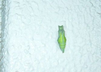 その後、カーテンの裾につかまたままの状態では、蛹からでても羽を伸ばすスペースがないことに気づき、移動させることにしました。カーテンの裾を少し切って蛹のお尻をはずし、体を支えていた糸を切ってカーテンからはずして、外壁に両面テープを張って蛹を固定しました。もちろん、猫の手の届かない高さです。