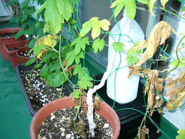 そこで、簡単な自動給水装置を作りました。ペットボトルを植木鉢よりも高い位置において、細く切ったタオルを垂らし、毛細管現象を利用しして植木鉢に給水します。