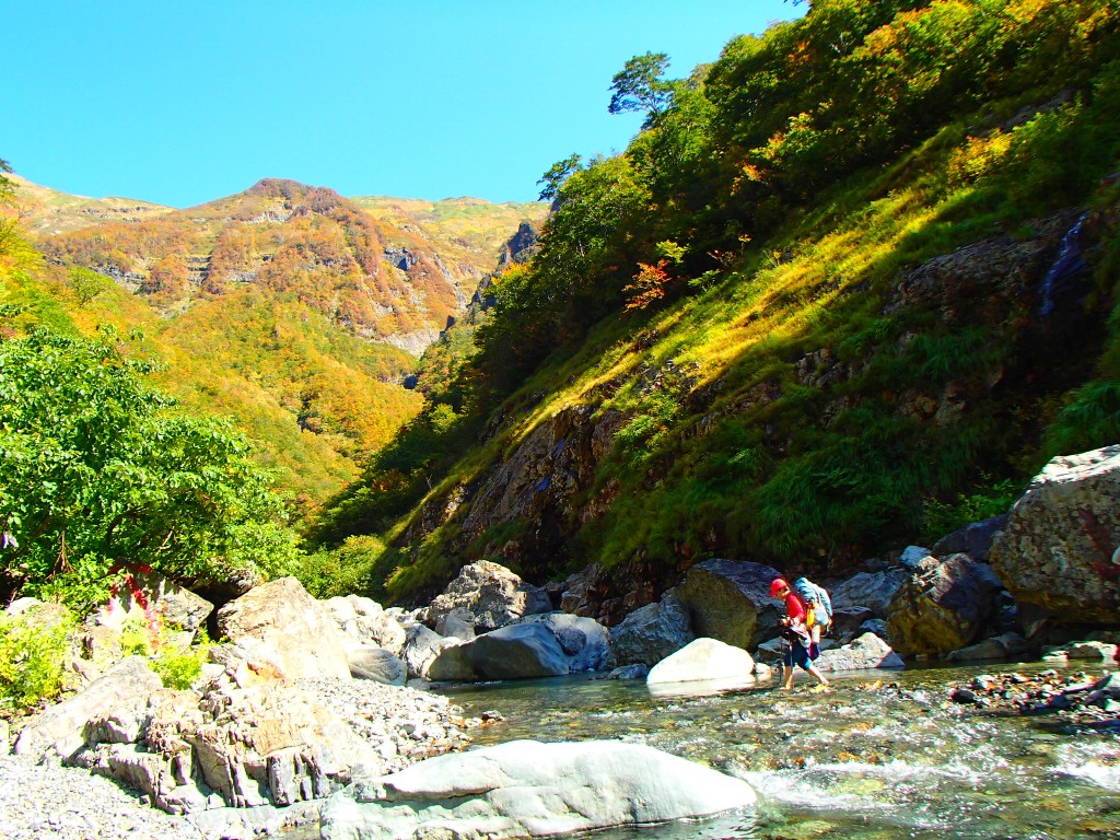 赤谷川沿いの道は、いのししの足跡はあるものの、人が歩いた跡はなく斜面をすべり落ちないように注意しながらトラバース、深い渓谷の絶景の底にある赤谷川の渡渉点へ。裸足で川に入ると水はとても冷たく急いで川岸へ。そこからが急な登りの始まりでした。
