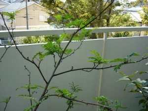 もう一枚の写真は、新芽の出てきた山椒にの木です。今年は、春から夏にかけて、ナミアゲハの幼虫が山椒の葉を食べていましたから、秋には、丸坊主になってしまっていました。気温の下がってきた10月中旬ごろから新芽が出てきて、今はご覧のような状態です。春ですと、「筍の木の芽和え」がすぐに浮かびますが、この季節は、何の木の芽和えがいいのかしら?やはり、ちょっと季節はずれ?
