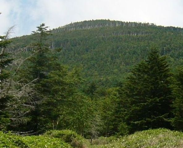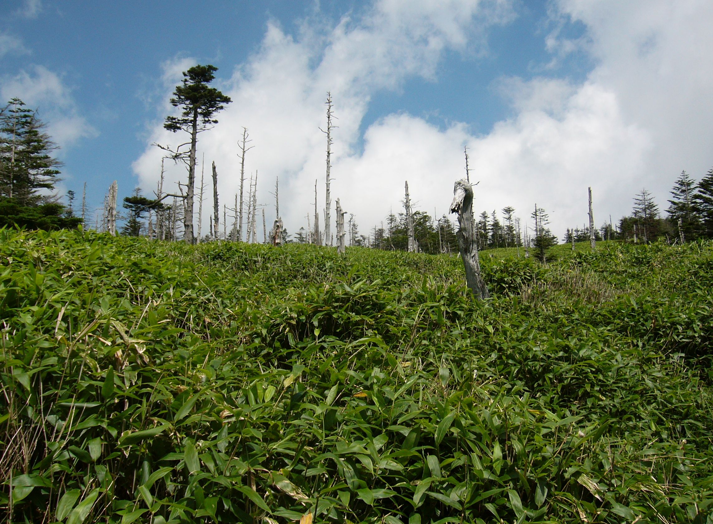 狭霧苑から北横岳に向かう途中で見た縞枯山(2403m)の”縞枯れ”です。山頂付近に何本かの白い横縞が見えます。北八ヶ岳付近では、針葉樹林が帯状に枯れて、何本もの白い横縞になって見える”縞枯れ現象”が知られています。坪庭からもこの現象を見ることが出来ました。この縞枯れ現象は、年々場所をすこしづつ移動していて、ほぼ等高線に沿って帯状に枯れているのが特徴だそうです。雄大な自然のサイクルに圧倒されます。