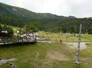 北八ヶ岳の空は、カラリと青かったです。立ち枯れた木が、鳥の嘴のように見えます。日差しは強かったのですが、湿度が低いので蒸し暑さを感じません。ロープウエイの混雑が予想されたので、乗らずに登山道を約1時間30分歩いてロープウェイ山頂駅へ到着。
