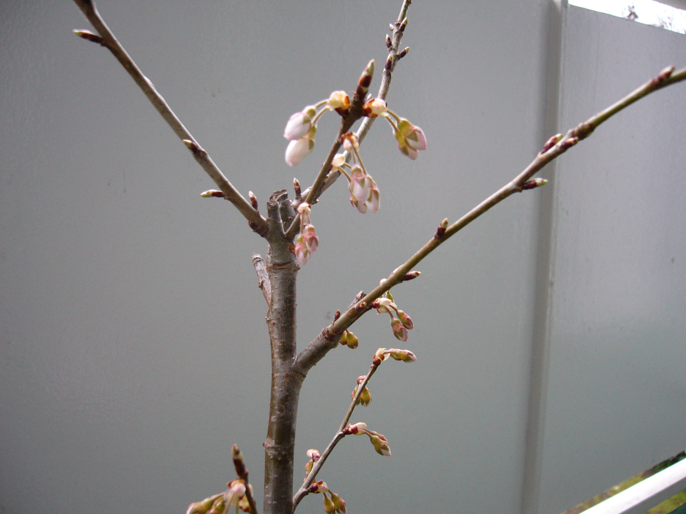 もう一枚は、サクランボの木です。サクランボは、異なる2種類がないと実がならないそうですが、この品種は1種類でも実がなります、ということで、昨年、植えてみました。うっすらと桜色のつぼみです。