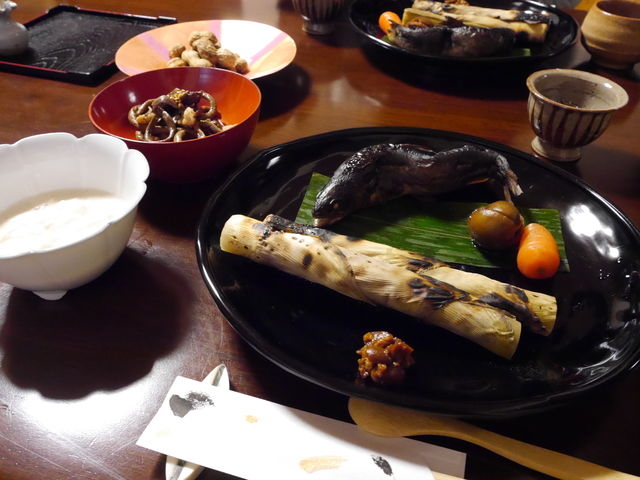 民宿「えーのかみ」の夕食、いつもそうなのですが、この後も次々と小皿料理や山菜の天ぷらなどが出てきました。筍は、昨年収穫し真空瓶詰めで保存したものを、焼き筍にして出されました。箸袋の絵から何から、すべてがお手製と言って良い食卓です。
