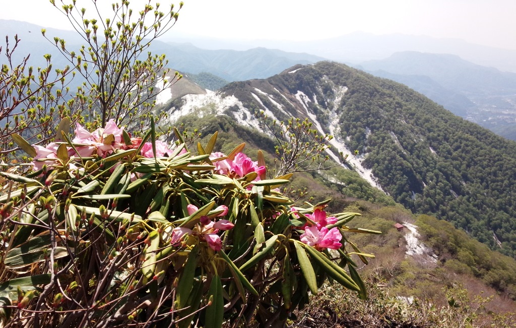 上の写真は、谷川岳トマの耳に向かう途中、肩の小屋を過ぎて天神平方面を振り返った時、登山道脇に咲いていたピンク色濃淡の美しい石楠花と天神尾根です。