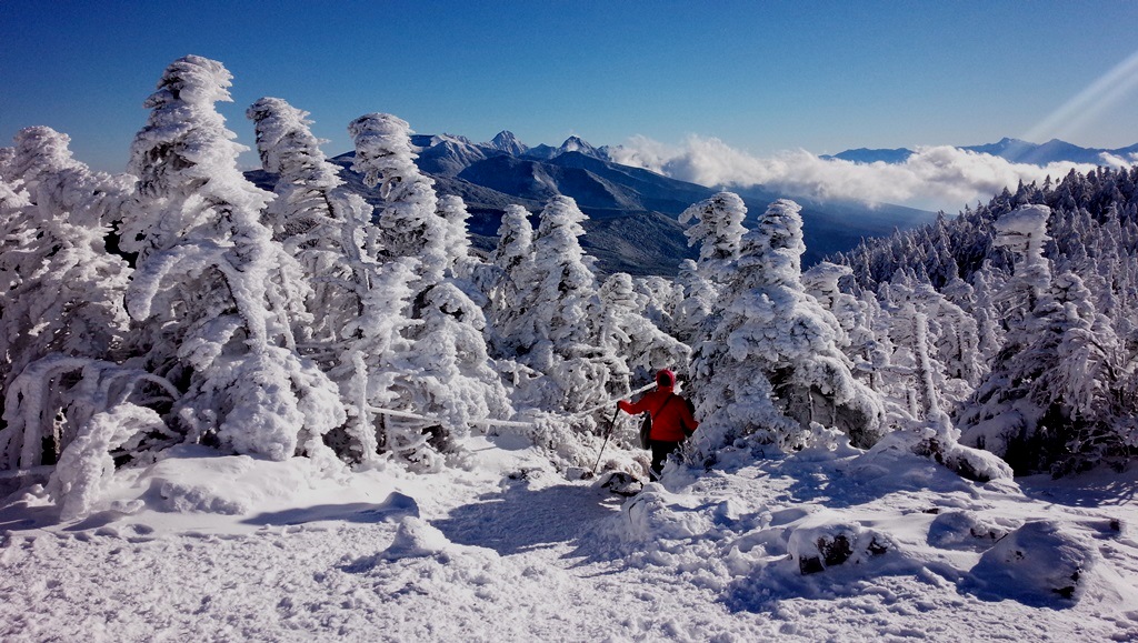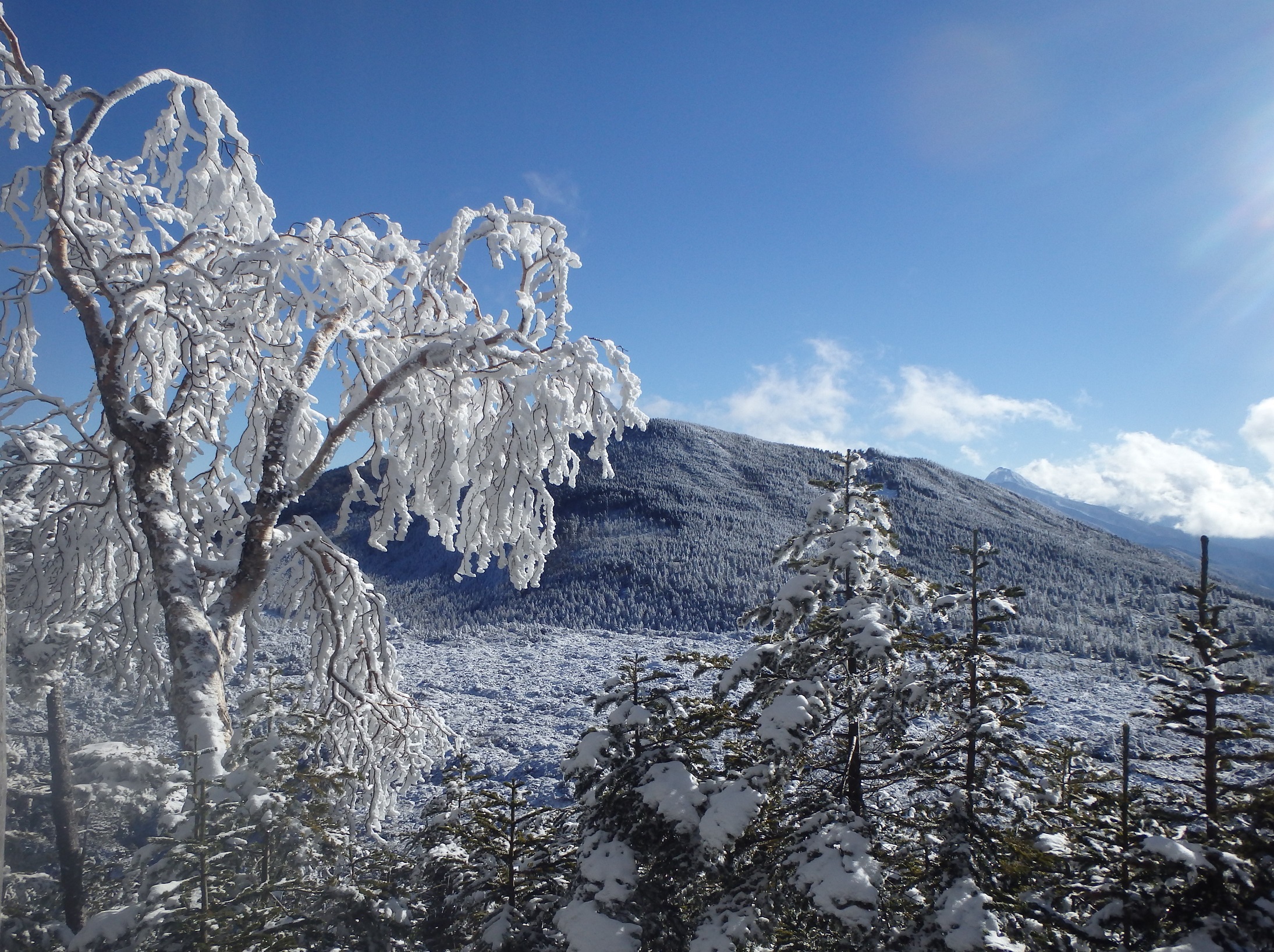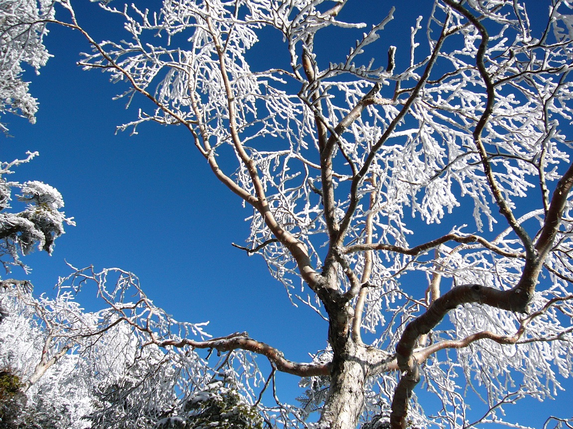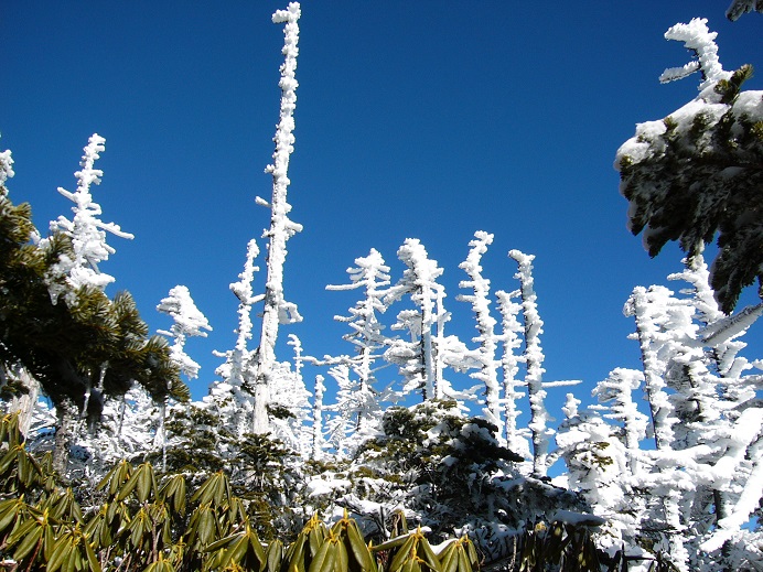 坪庭から北横岳ヒュッテに向かう途中、登山道沿いの木々の枝が雪に覆われて美しい。