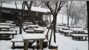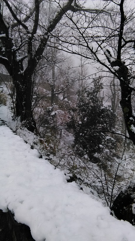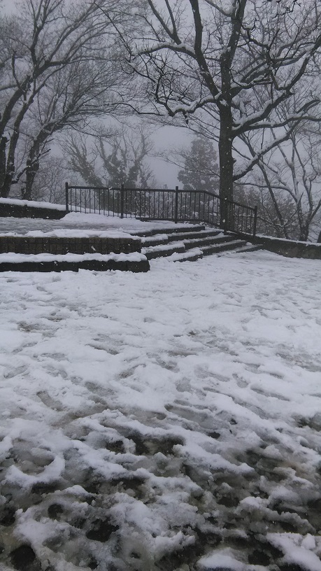 3月26日(日)高尾山は積雪約10cm、傘をさした登山者が時々やって来てすぐ帰る