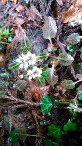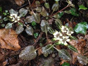 雪の日の高尾山 自然観察6号路の小川の側で見つけた黄色い花が咲いているように見える 植物は、