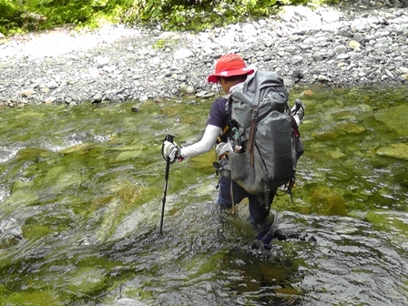 渡渉点で沢靴、地下足袋&ワラジ(手作り)に履き替え。水は冷た過ぎずいい感じ、滑らないように気をつけながら、幌尻山荘を目指しました。