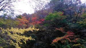 麓は、まだ紅葉一歩手前、ダム付近は紅葉、ユーシンロッジ付近の山々の山頂付近は落葉後でした。 ユーシンブルー(水は青以外の色を吸収するので青く見える)と紅葉が目当てのハイキング、