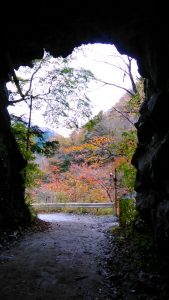 玄倉林道の趣のある古いトンネルの中から見た紅葉。