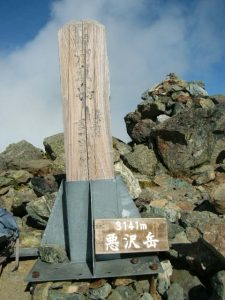 青空の見える荒川東岳(悪沢岳)、この後下から雲がどんどん湧いてきて稜線を覆ってしまいました。
