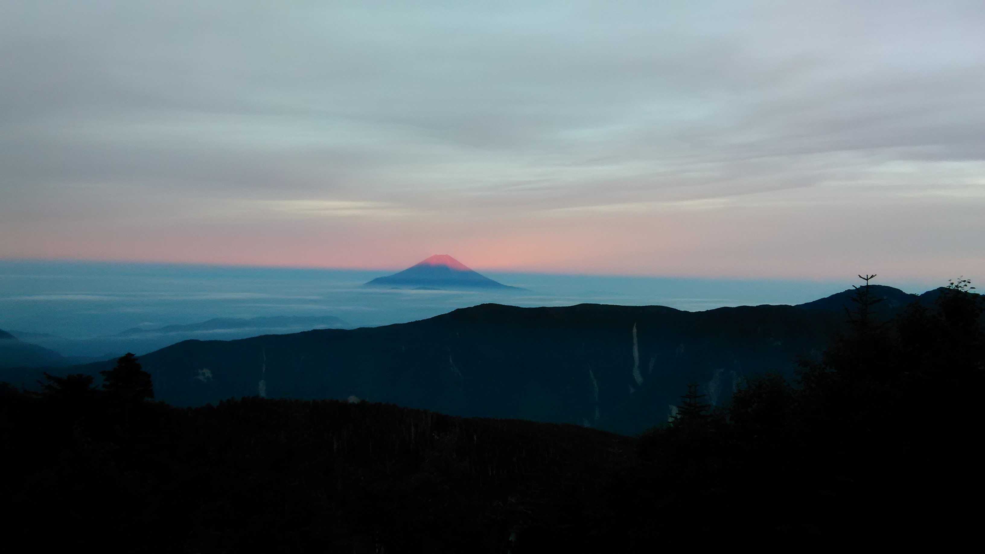 千枚小屋から見た朱鷺色の富士山山頂です。日没後は外にいられない程寒くなり、千枚小屋から千枚岳に向かう途中、すでに七竈の実が色づいていました。