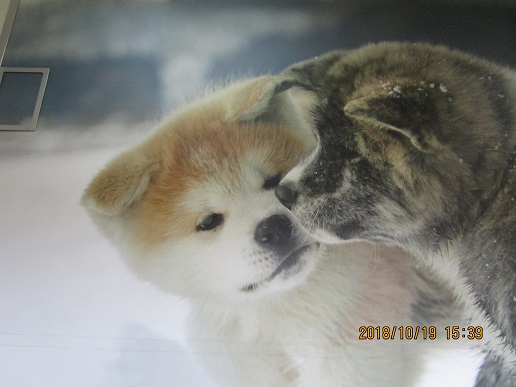 秋田内陸鉄道の列車内には、たくさんの秋田犬の写真が並んでいましたし、阿仁スキー場ゴンドラ乗り場には、垂れ目のかわいい秋田犬がいました。