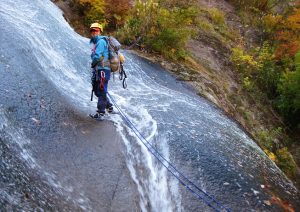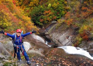 上流部は3~10m前後の小滝と甌穴の連続、ガイドさんの身長が180cm、甌穴の大きさがわかります。