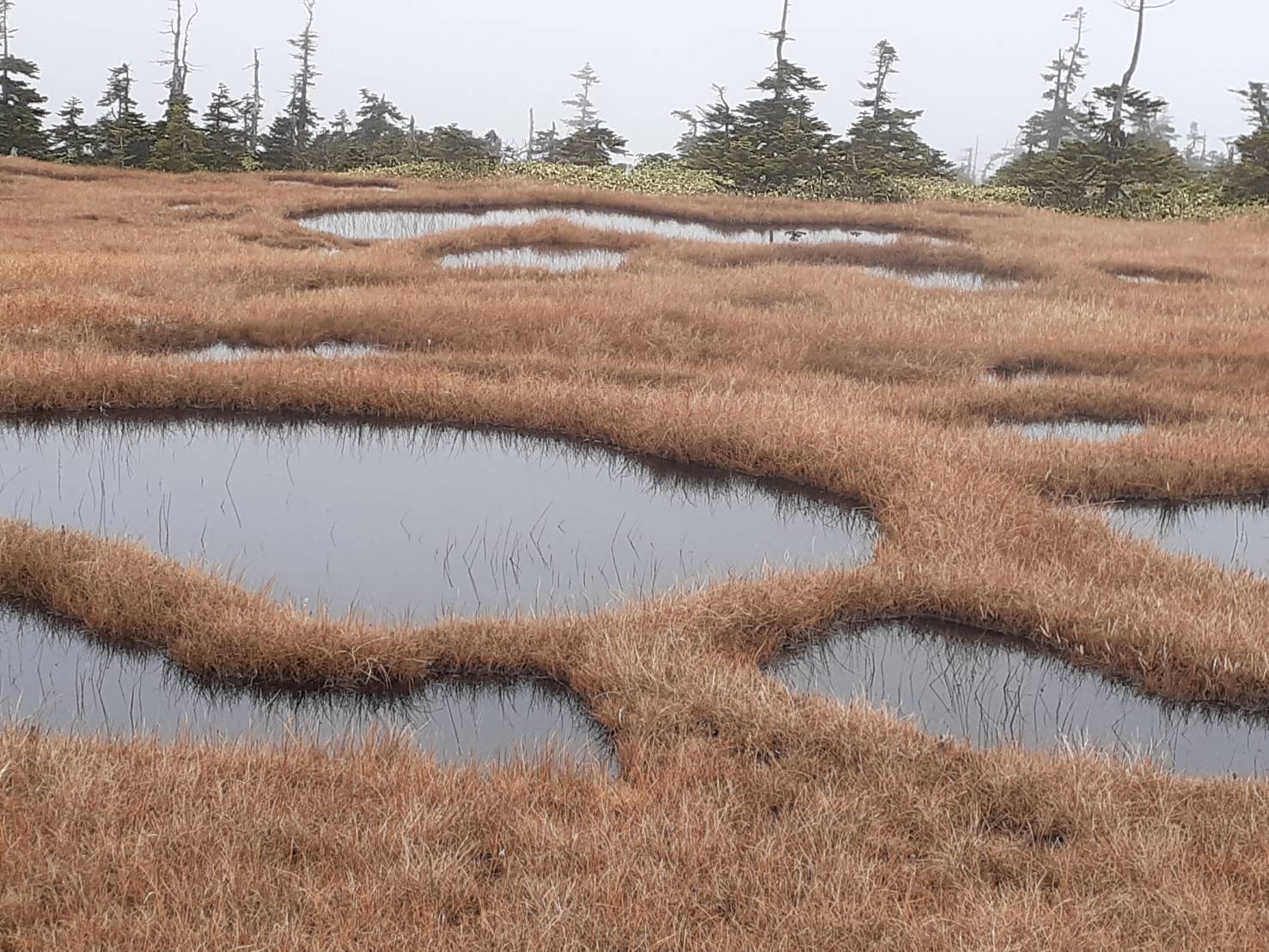 スキー場終点からが登山道、少し進むとダケカンバの森、倒木があったが比較的傾斜も少なく歩きやすい道が続いた。田代湖が見えて湿原と池塘があり、その後草刈りのしていない笹のある稜線に出て、祓川方面からの登山道と合流、そこで一気に人が増えた。