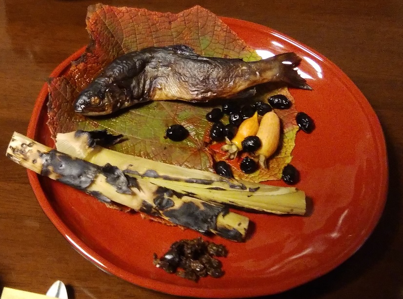 楽しみの夕食、お魚の付け合わせに、完熟またたび、茸の天婦羅、舞茸ご飯、茸汁。朝食には、虫こぶまたたび。