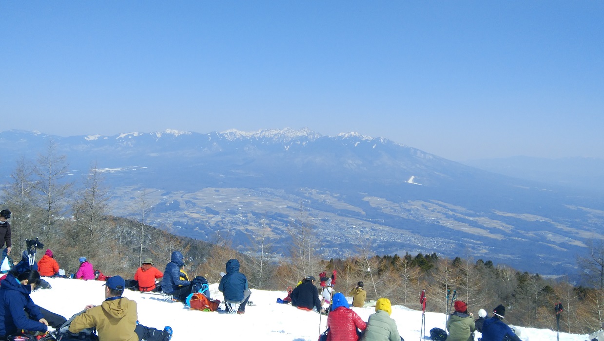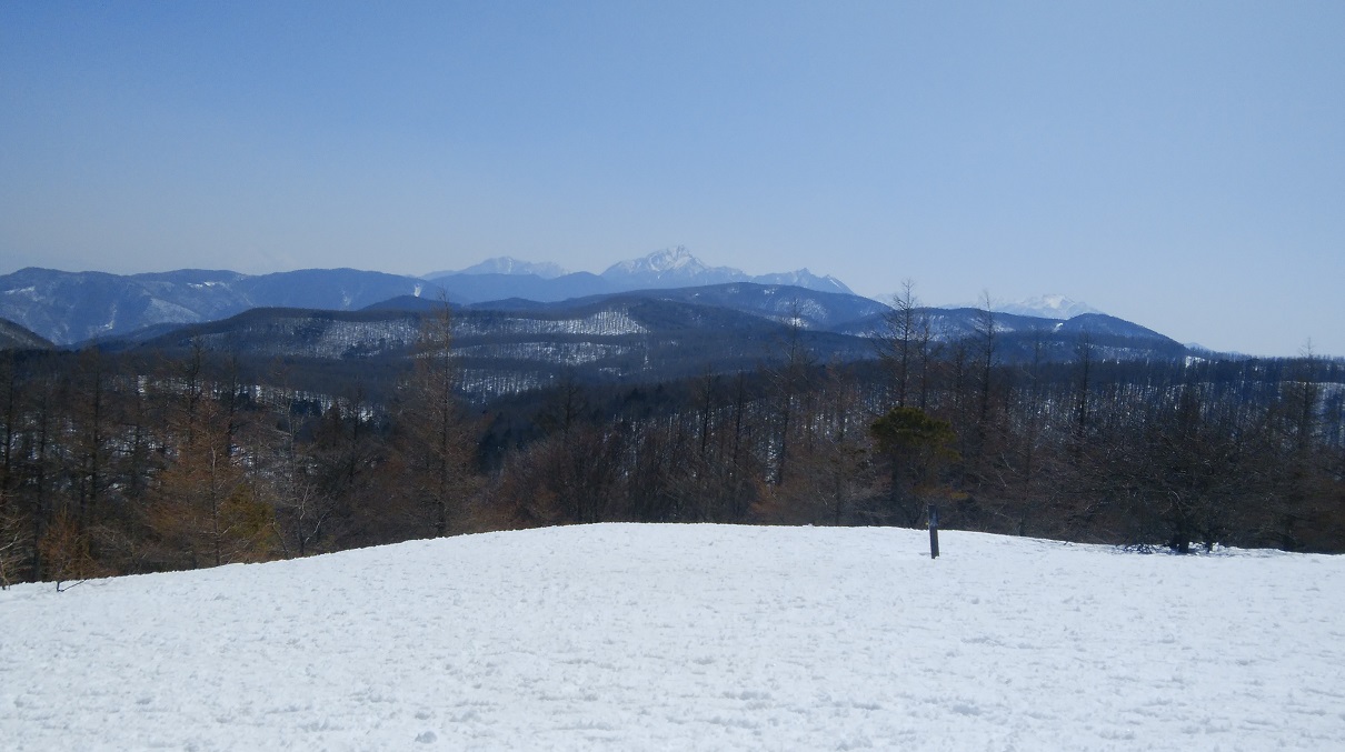 遠くに富士山、甲斐駒ヶ岳から仙丈岳、八ヶ岳、中央アルプスの山々。